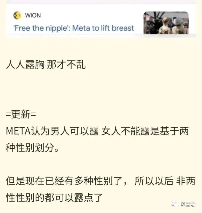 原因很简单。META认为,男人可以露,女人不能露,是基于两种性别划分。但现在是多性别时代,这个划分OUT了。