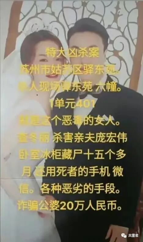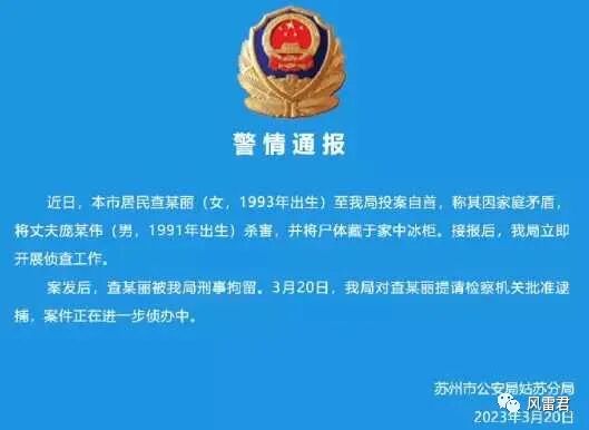 一位93年出生的妻子查某丽,将91年出生的丈夫庞某伟杀害,将尸体放置于家中大冰柜里长达15个月之久(确切时间有待尸检证实)。