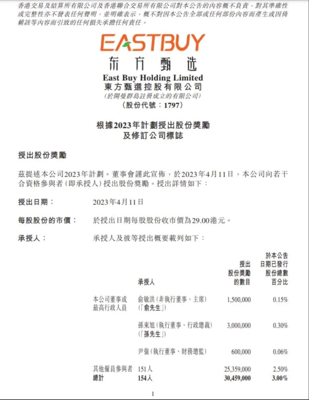 为了激励员工,留住人才,东方甄选向154名核心员工授出股份奖励,价值7.75亿元。