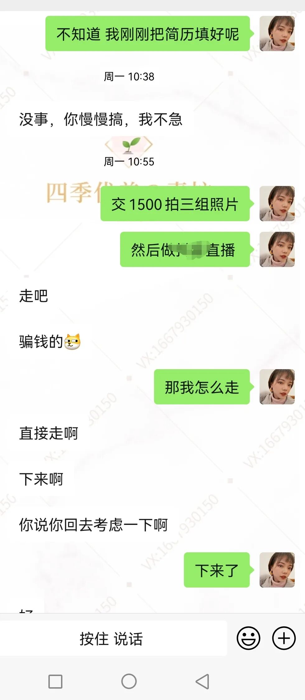 然后就开始逼单,我们现在是缺人才招聘,下周开始我们就要进影棚了,要把人员定下来,你现在拍3张形象照,我们拿你的照片去给你接单,给你安排你的时间进行拍摄。你做个兼职一次大概就300-800收入了,平时工作忙在家也能做寄拍模特,现在随便在外面拍个照也要3000……(饥饿营销?营造一种很着急,现在就要做决定,错过这个机会再没有的感觉。实不相瞒,我这几年出去旅游,举办大型活动,新品上市,每次都是请的专门的摄影师,专门拍宣传片,导致我现在照片都拍厌倦了。)