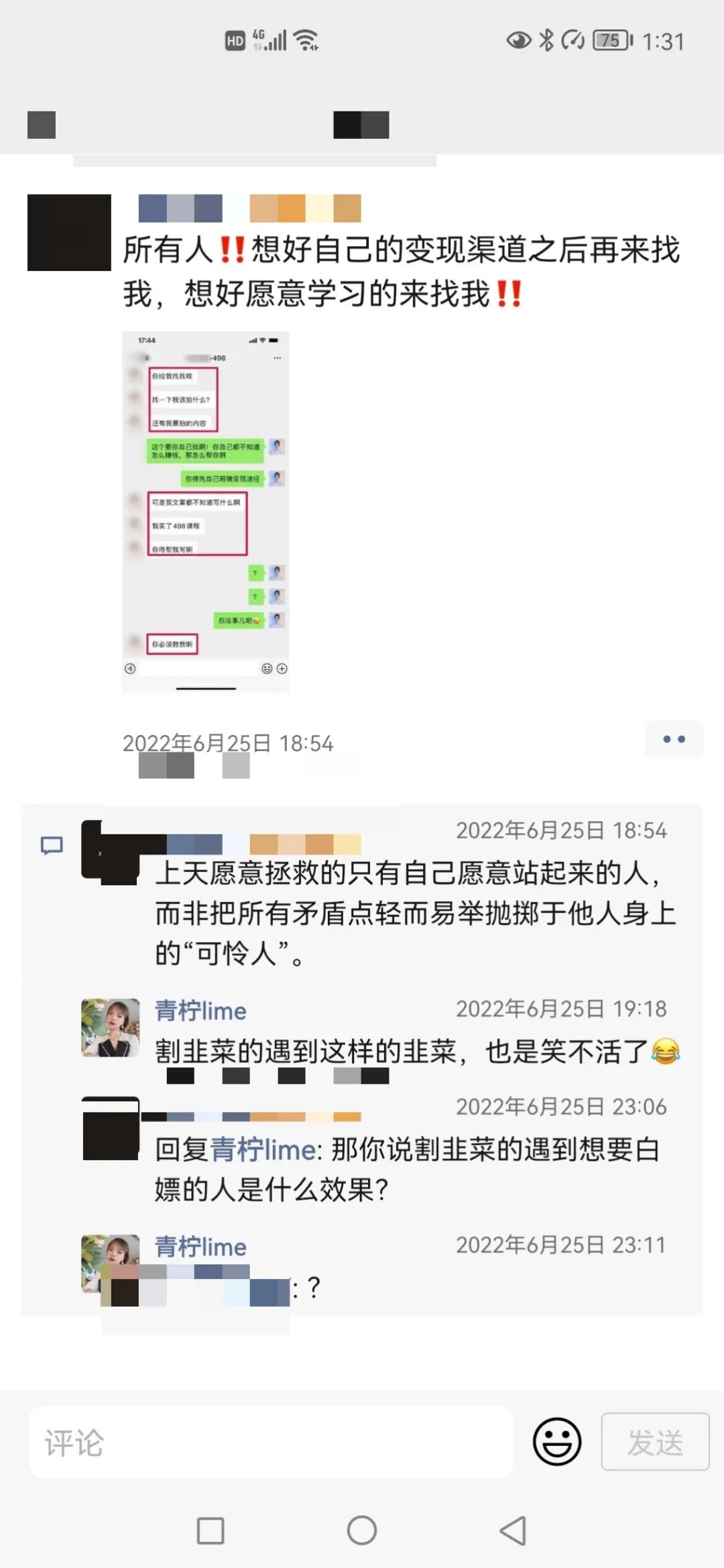结果他说我是白嫖的。我加她到现在没有聊过一次天,我都没想明白我白嫖她啥了。这个朋友圈评论实在是我刚好看到觉得太好笑了。没忍住。