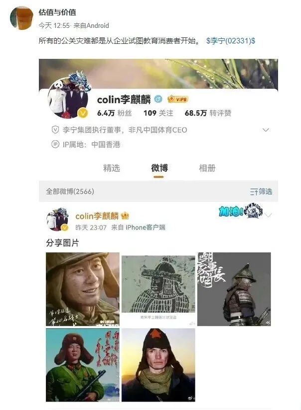 然后,李宁集团执行董事李麒麟,则在微博分享了几张图片。里面有雷锋,有保尔柯察金,也有明代盔甲复原图。