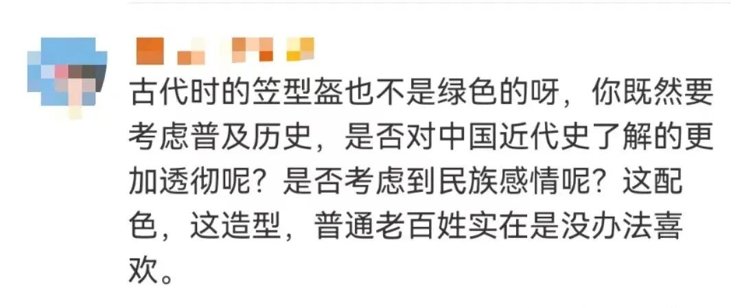 有网友直接回怼了过去,称古代时的笠型盔并不是绿色的,既然要考虑普及历史,李宁是否对中国近代史了解的更加透彻?是否考虑到民族感情呢?