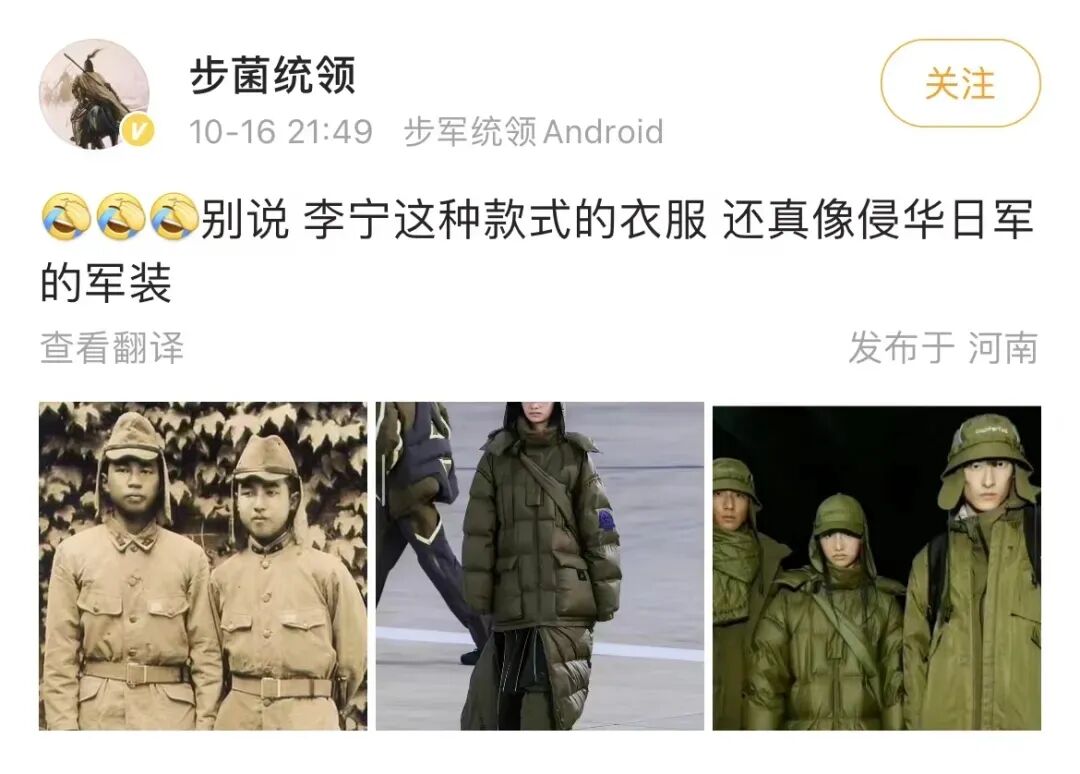 李宁这次推出的新品,与诸如“神似日本军服”“CEO是日籍华人”“曾是优衣库高管”等一系列信息放在一起时,难免让网友自由解读。