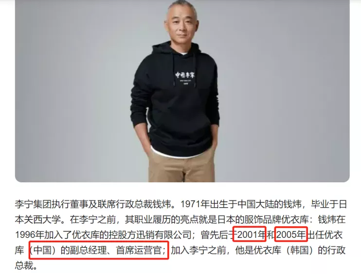 而且入职李宁之前,钱炜在优衣库工作长达23年。