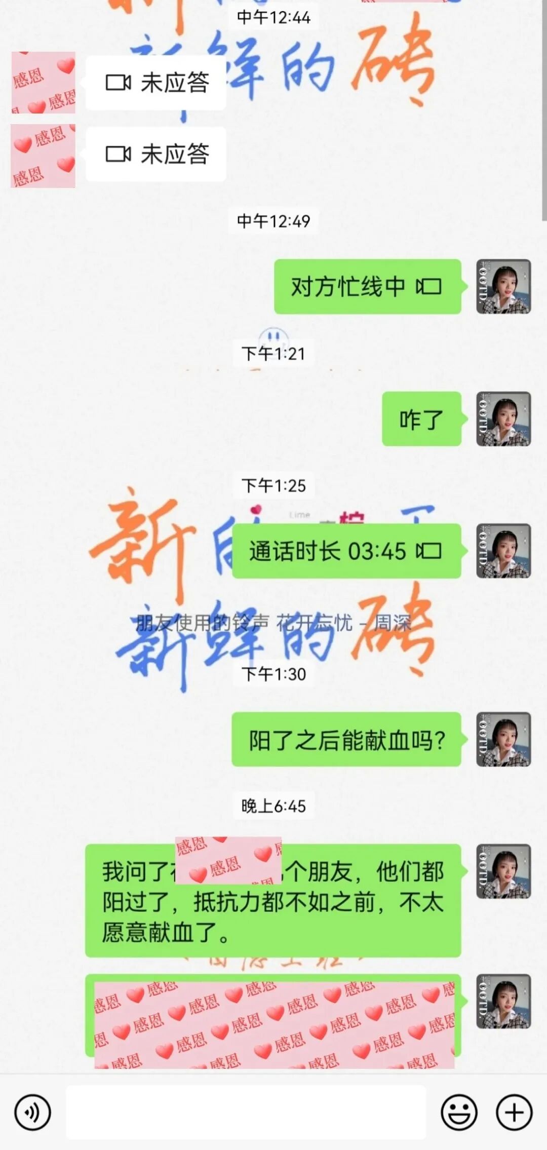 正阳的、阳过的、未阳过的,都对未来深深地担忧,谁都不知道自己的身体将会如何!献血究竟对自己身体有没有影响,不得而知,那又何必冒风险呢!