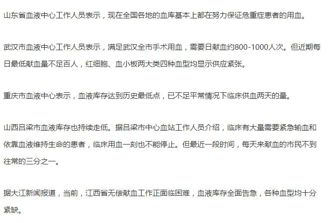 不仅仅是山东,近期,浙江、江苏、湖北、山西、江西、四川、北京、河南、福建、甘肃、上海等全国多地都传来了血库“告急”的消息。