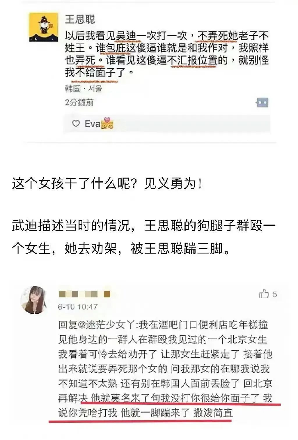 上一次轰轰烈烈打人事件,打的是一个网红。打完了以后,王思聪发过一条朋友圈,说的是以后那个网红他看见一次打一次,光是打这个网红一个人还不够,包庇这个网红的也要打,打完包庇的还不够,看见网红不会报位置的,一样要挨打,好可怕,好吓人。