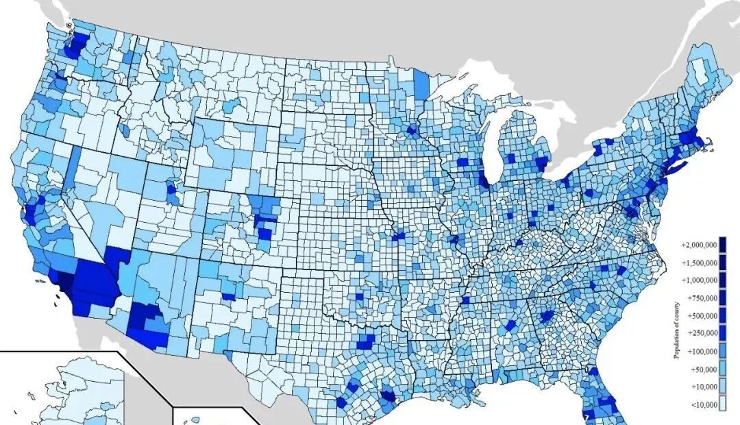 下图中,蓝色的区域就是人口在流失的区域,而红色的区域是人口在增长的区域。