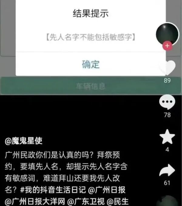 网友@魔鬼星使 在短视频平台称,在广州民政祭扫预约系统上,填先人名字时被提示“先人名字不能包括敏感字”对于这样的弹窗他很无奈:难道拜山还要先人改名?