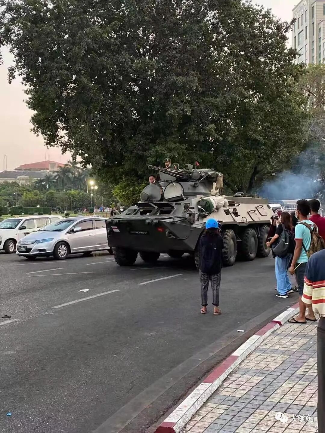 2月14日下午开始,缅甸仰光省、实皆省、掸邦、克钦邦等省邦形势骤紧,多辆载满军人的车辆和多辆装甲车已经驶向各省邦主要城镇的街头。