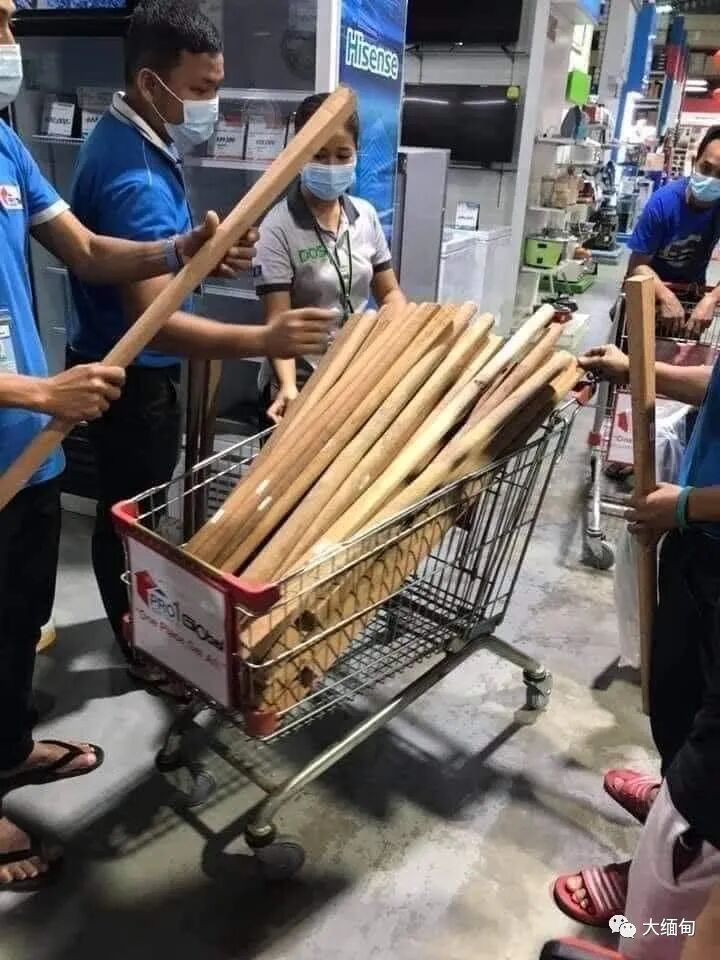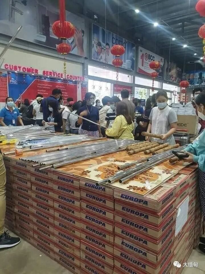 由于安全感缺失,仰光部分市民昨晚前往超市卖场购买铁棍、棒球棍、手电筒等。