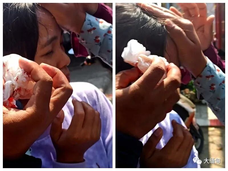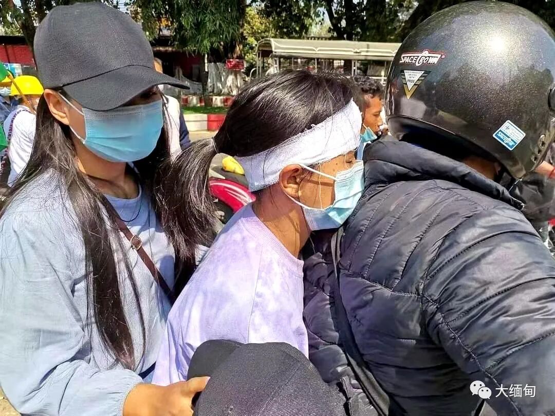2021年2月23日下午,缅甸克钦邦密支那镇区举行抗议军方示威活动,军方士兵打弹弓驱逐示威者,有一名年轻女性的头部遭到攻击,血流满面,所幸是没有伤到眼睛。