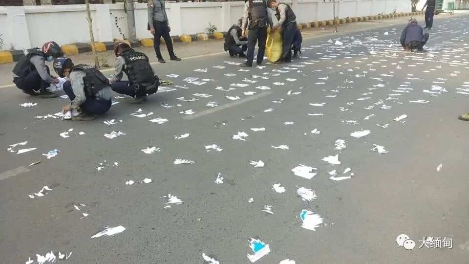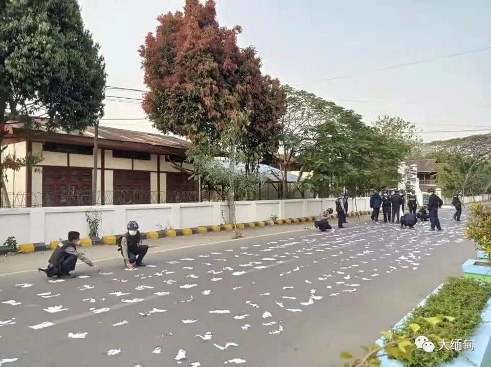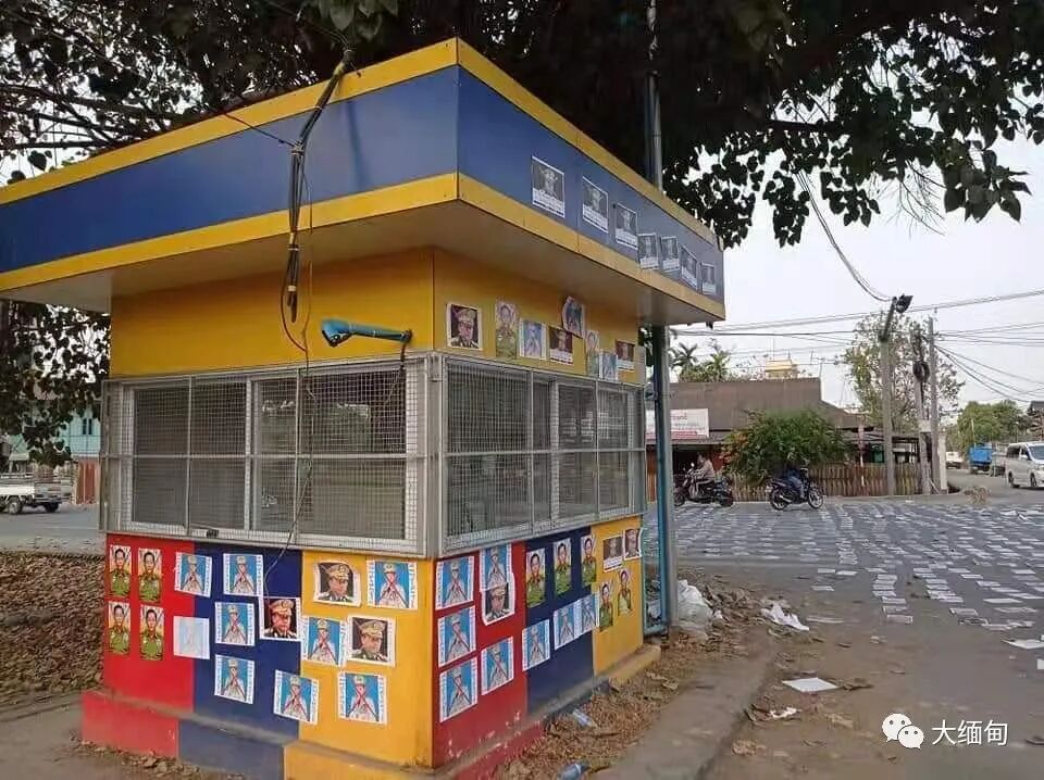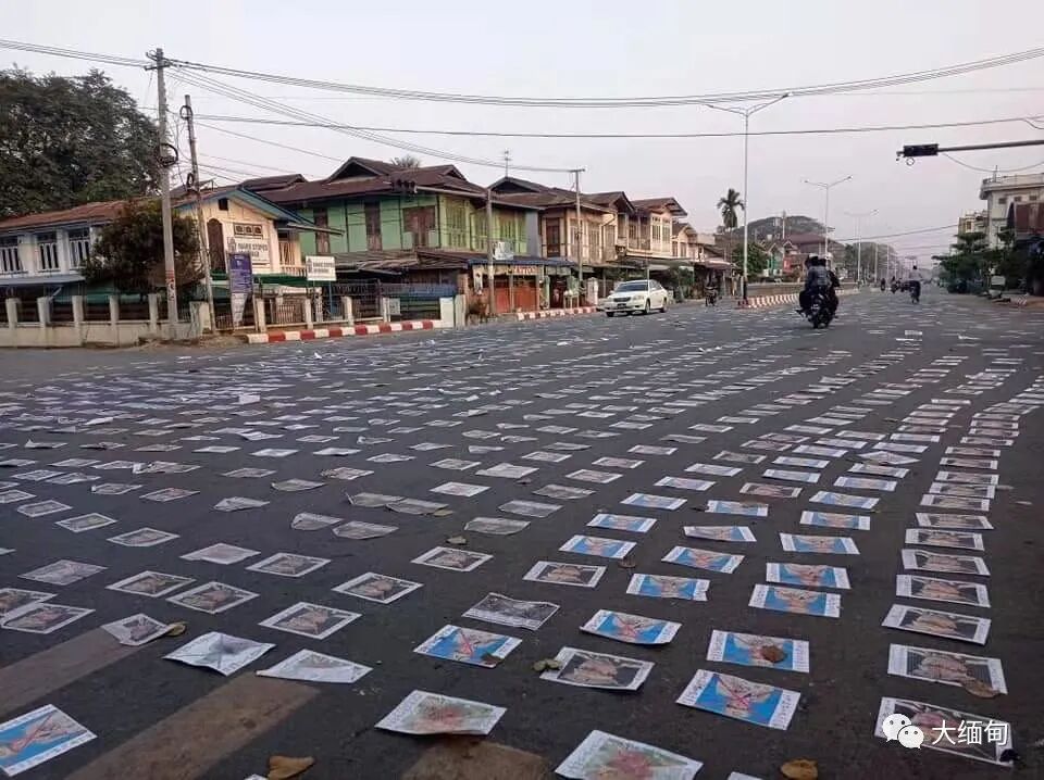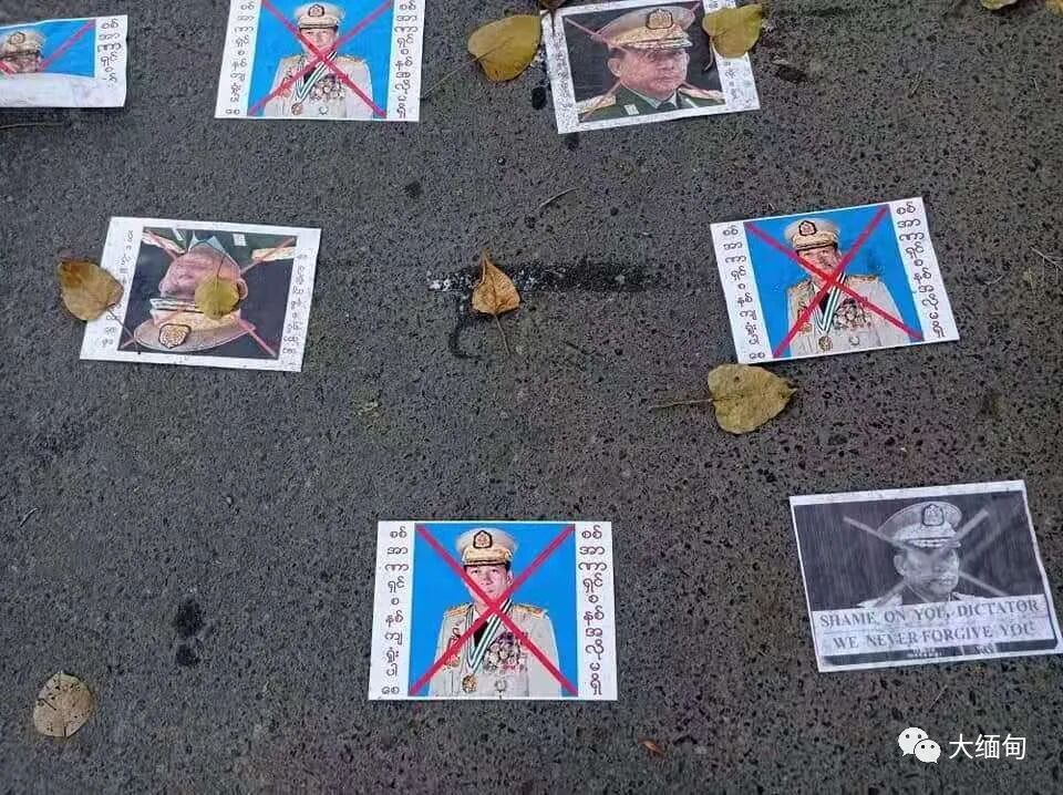 克钦邦密支那镇的500病床医院、第1高中学校、第3高中学校等门前的马路上贴满了敏昂莱大将等人的照片,写着军方下台、打倒XXX的口号。遍地都是这样的照片,看着十分“壮观”。