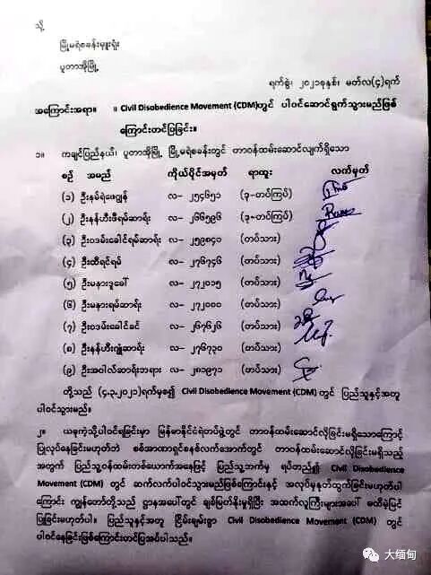 2月1日军方掌权至今,军警向示威群众开枪致多人死伤,多个地区的公务员、警察陆续宣布加入CDM运动即不与军方政府合作,加入罢工的行列。
