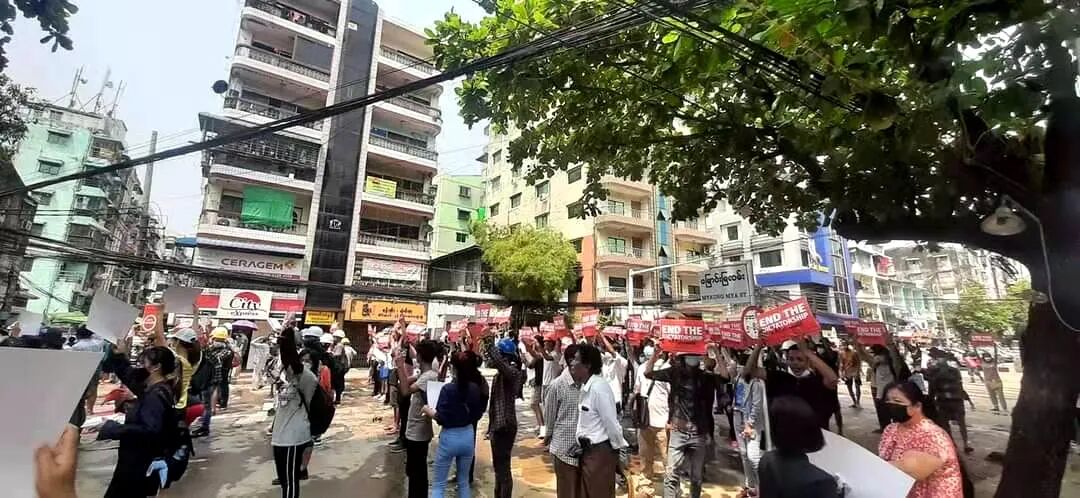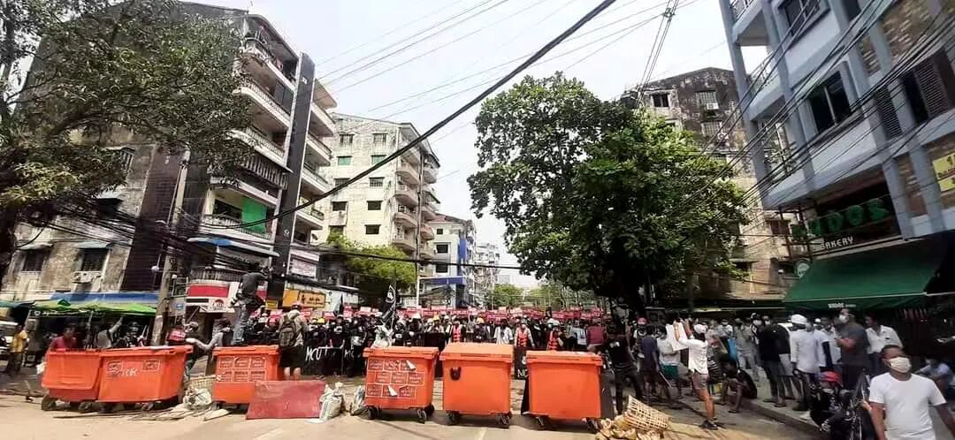 3月12日,仰光市珊羌镇区的瓦溪码路上,当地群众正在举行抗议示威活动。这是今天上午11点22分时的场面↓↓