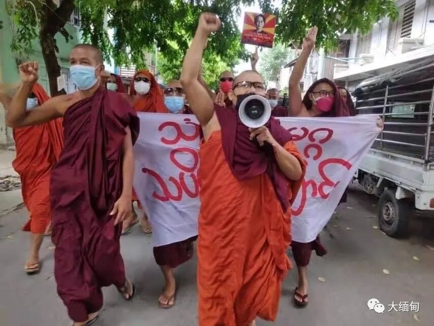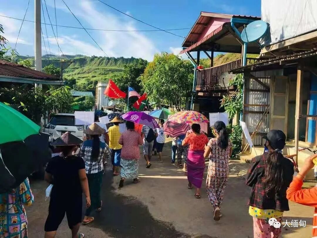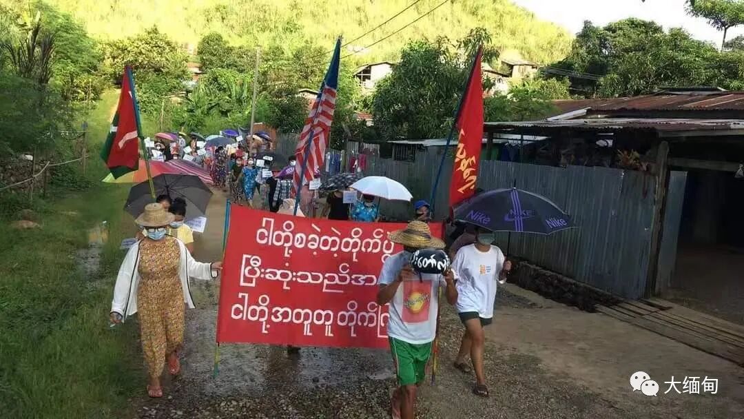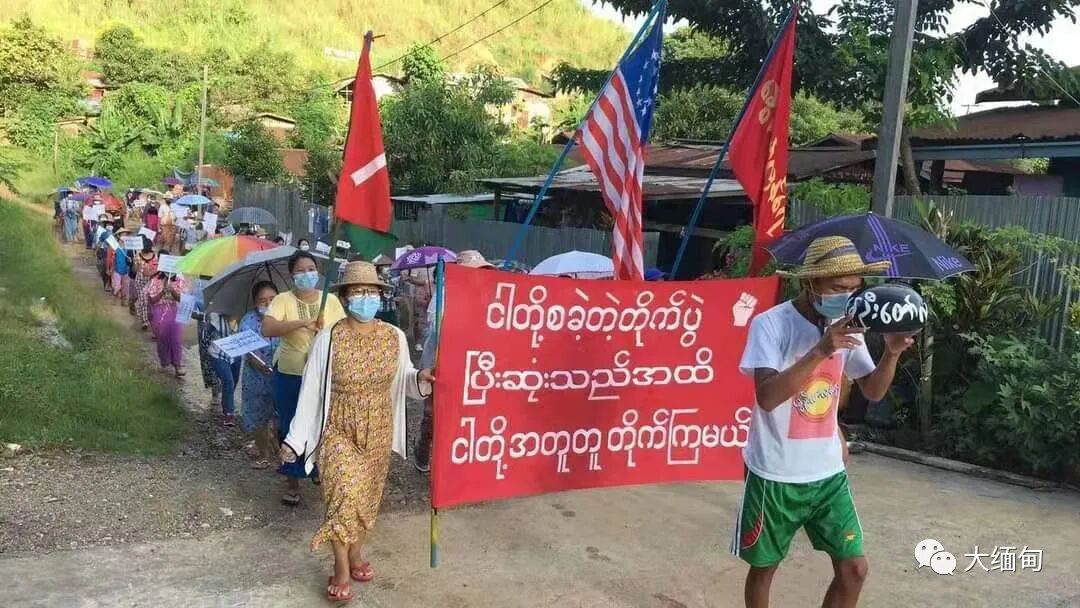 7月9日中午,缅甸克钦邦帕敢镇部分群众举行抗议示威活动。示威群众举着“民族团结政府”NUG的旗帜(也有说是美国旗帜)、克钦族旗帜、革命旗帜呼喊口号。