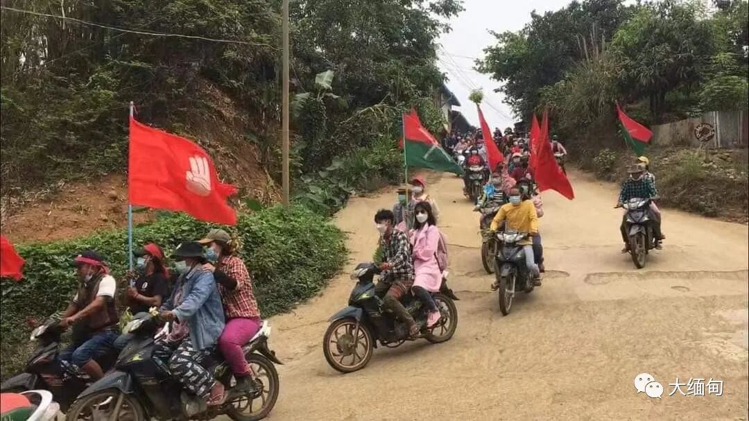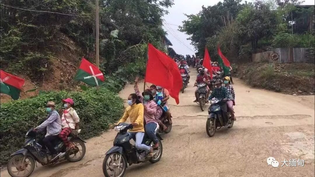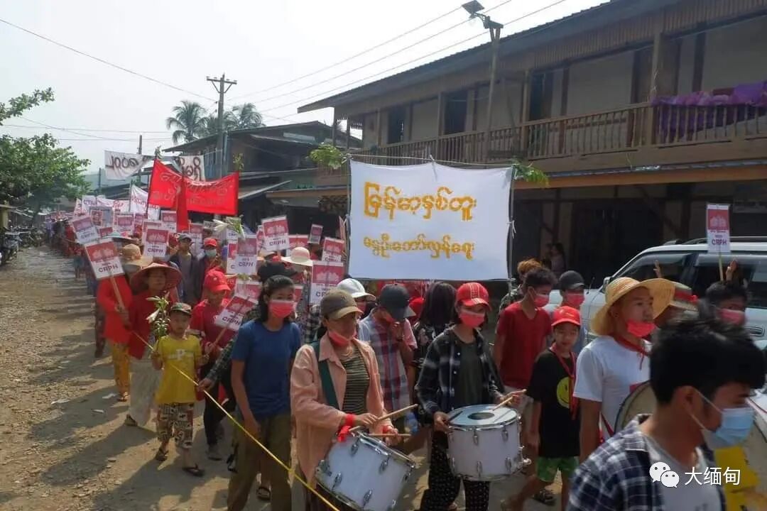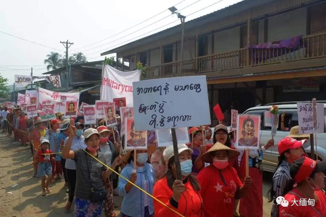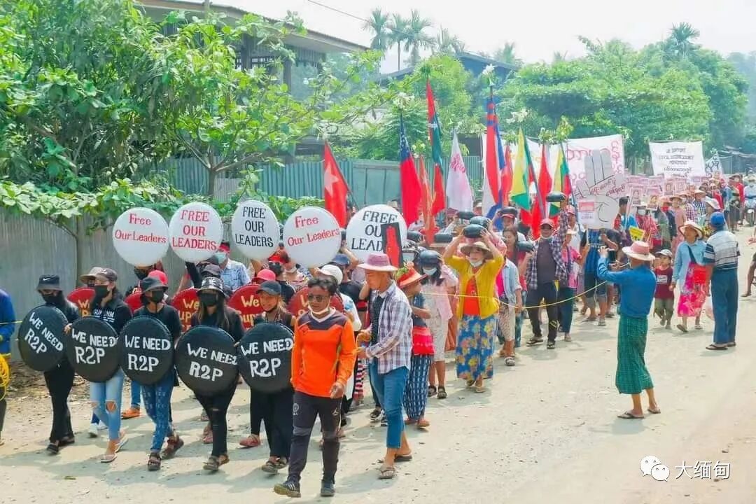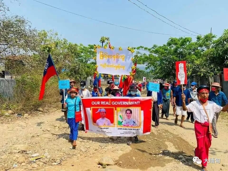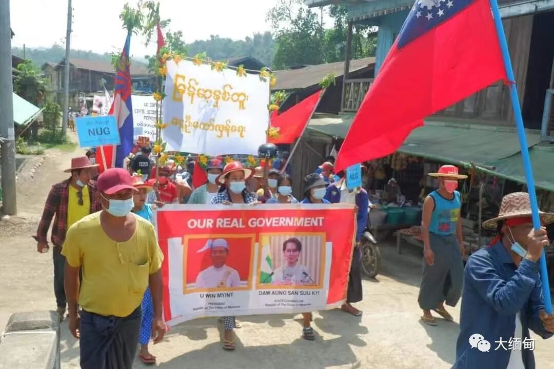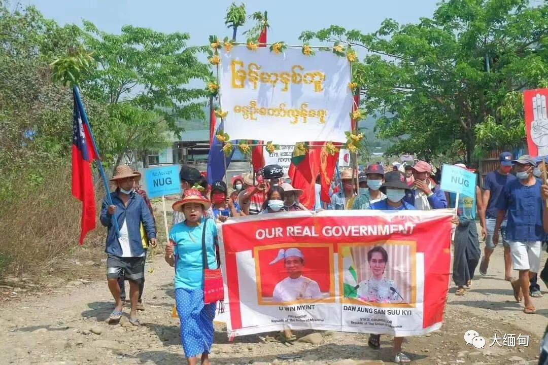 当地民众上街游行时展示了拥护国务资政昂山素季和总统温敏的照片,高呼口号支持克钦独立军(KIA)、人民卫队(PDF)和民族团结政府(NUG)。