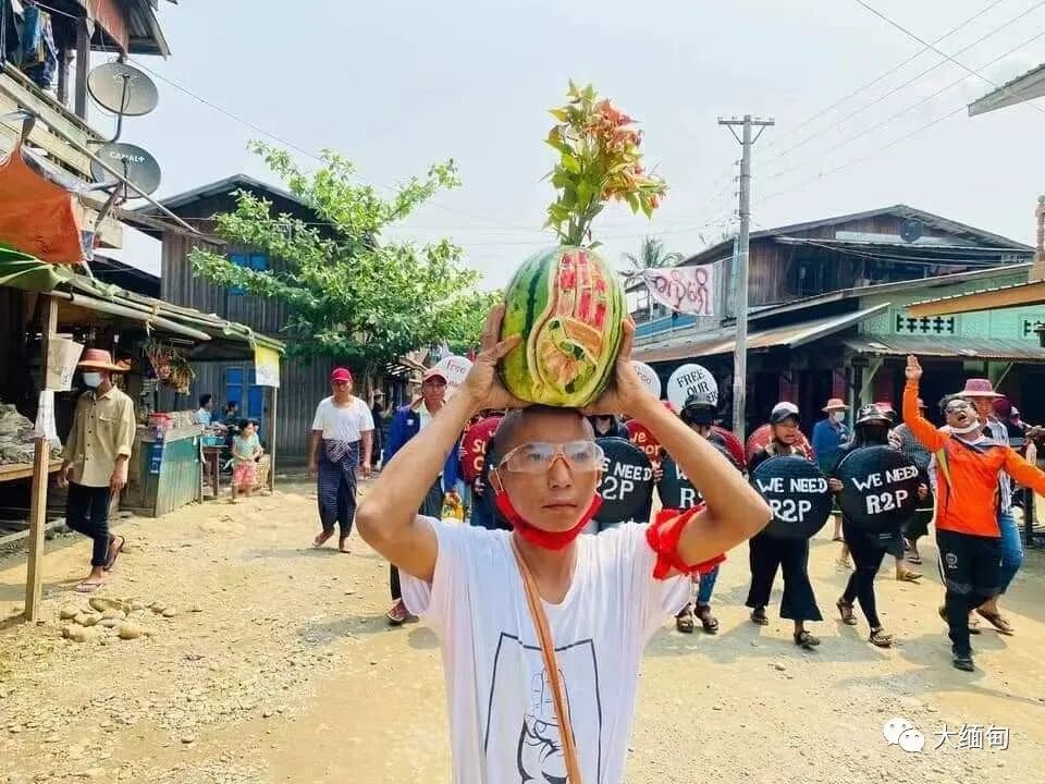4月15日,缅甸克钦邦翡翠产地帕敢镇区的民众举行“革命化泼水节”活动,以此迎接缅历新年的到来。