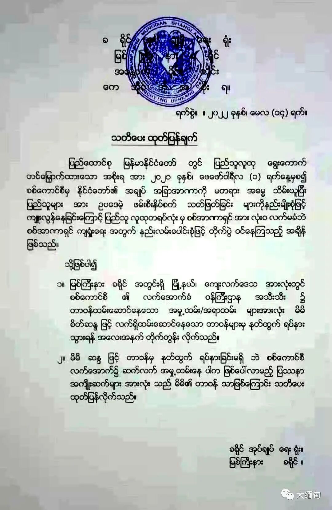 5月14日,克钦独立组织/克钦独立军(KIO/KIA)的密支那县、新必仰县、户冈县、德奈县管理部门发布一份警告书,敦促军方管辖下的各县综合行政管理局及相关部门官吏主动辞职。
