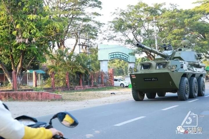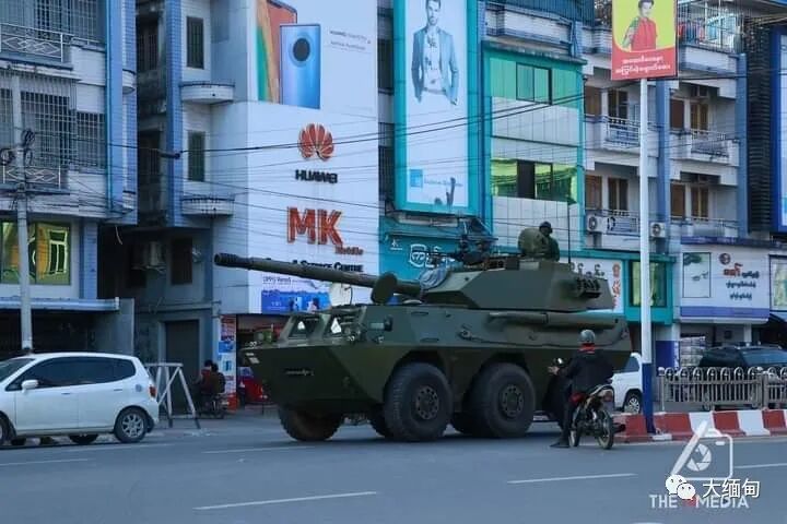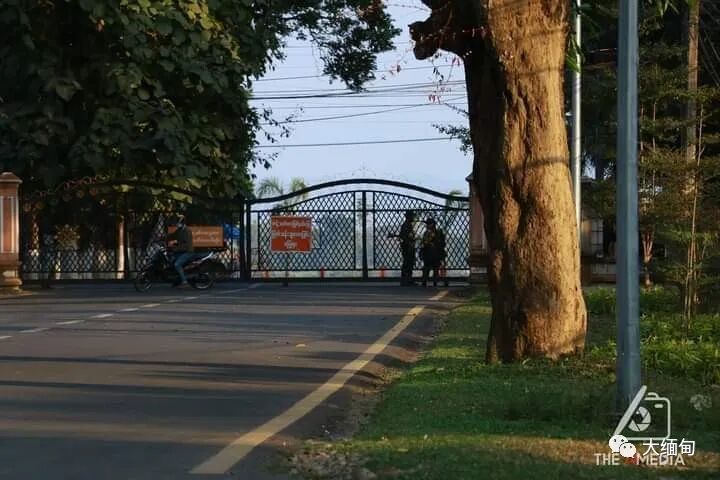 军方政变之后,克钦邦密支那镇的政府驻地,大门被关闭,国防军的装甲车在街道上穿梭巡逻。