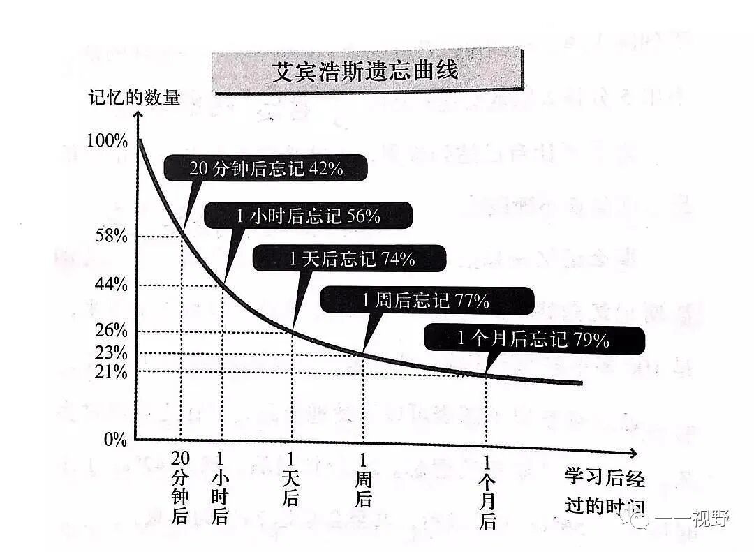 人脑的记忆系统是有规律可循。根据艾宾浩斯遗忘曲线,每次信息的重复输入,其维持记忆的时间是各不相同的。人的遗忘从认识记忆后便开始,先快后慢。因此,复习的时间间隔就应是先短后长。应在第一次记忆后隔二十分钟记一次,第二天再记第三次,一周后再记第四次,一个月以后记忆第五次。