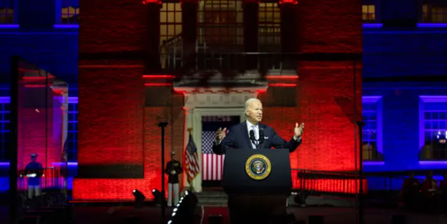 拜登说:“我今天站在这里,费城的独立厅,这里是两世纪前美国宣布独立的地方,美国精神在世界独一无二,就是站在这片土地上,我们真正的生而平等。”