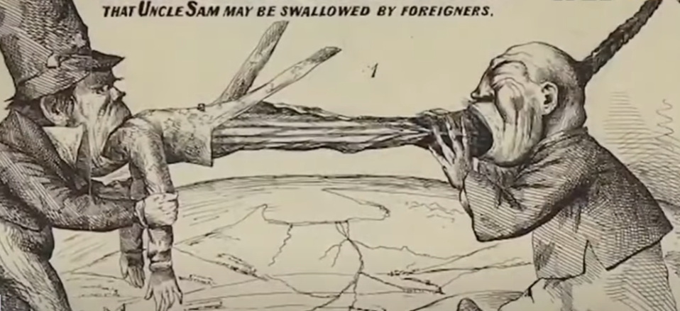 上面这张图就是当时典型的,“种族恐惧论”,精英白人害怕黑人和清朝劳工用出生率,来把白人“生吞”了。
