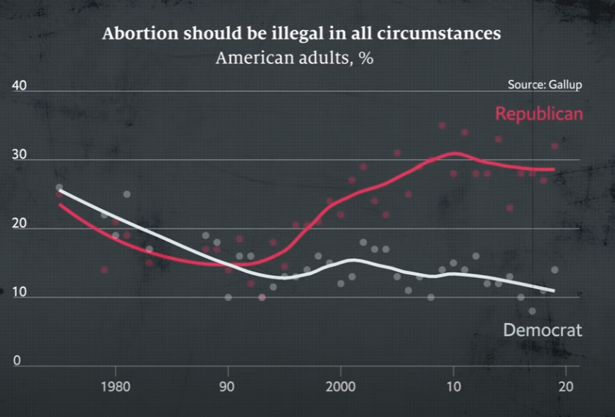 可以看到在1990年以前,两党对于是否支持堕胎的观念上,只有很小的差异。