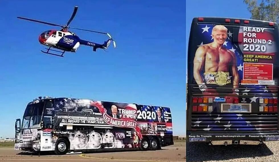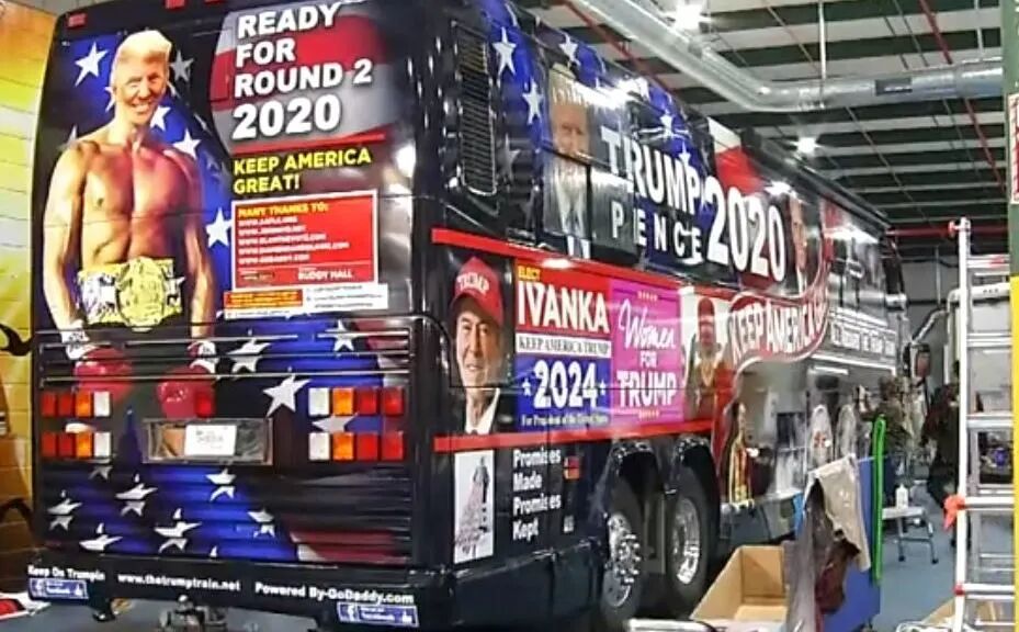 霍尔拥有全美国最多最吸睛的特朗普大巴,后来还弄了特朗普直升机过来。