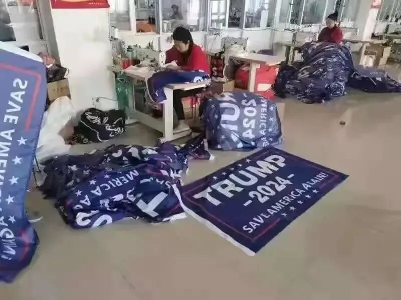 相关工厂又忙起来了,印有“2024特朗普拯救美国”字样的旗帜,成批成批的制造。