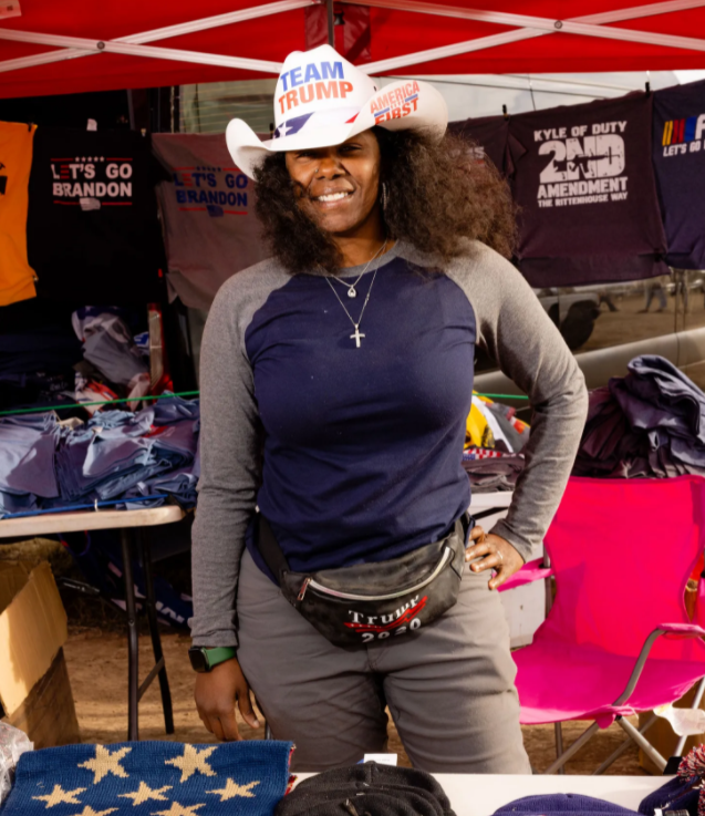 来自亚利桑那州的黑人女性丽萨,是一名卖特朗普产品的专业户,特朗普还亲自和她握手,赞扬她的爱国举动。