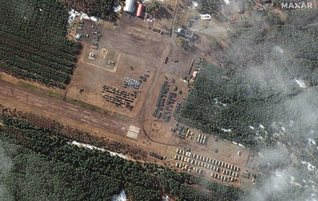 卫星图像显示,更多军事帐篷和装甲车进入乌克兰边境营地,另外大批油罐车进入机场,似乎在预示着更大军事行动的发生。