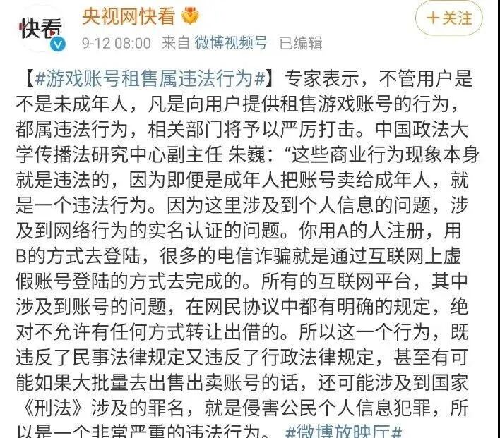 中国政法大学传播法研究中心副主任朱巍表示,管用户是不是未成年人,凡是向用户提供租售游戏账号的行为,都属违法行为。