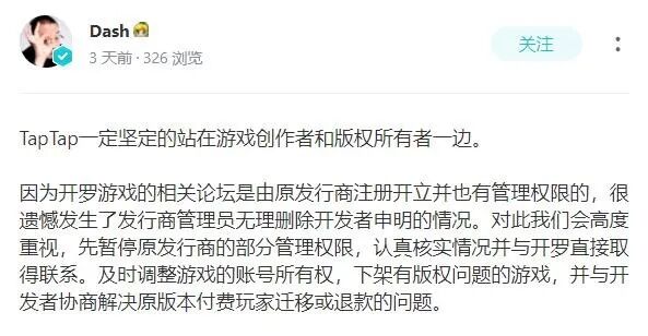 TapTap发现此事后立马开始着手处理。先是公开了识君版主删帖的日志证据,而后心动CEO黄一孟更是亲自下场,在评论区表示“TapTap一定坚定的站在游戏创作者和版权所有者一边”,声明中提及的山寨游戏也被TapTap贴上了“争议游戏”标签。