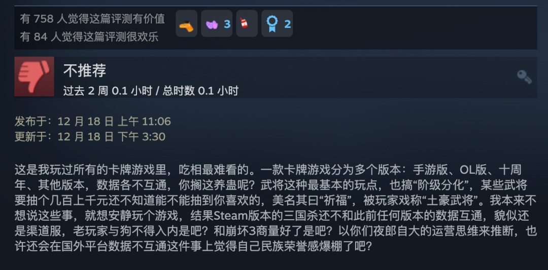 在游戏性上,随着版本的更迭,新设计的武将实力明显要强于老版,造成了许多玩家手里的旧卡价值降低,武将失衡严重。在老武将变弱,新武将需要重新付出成本获得的情况下,玩家们自然而然对官方产生了长期的不满情绪。而此次Steam版的上线,自然成为了玩家的“火力集中点”。