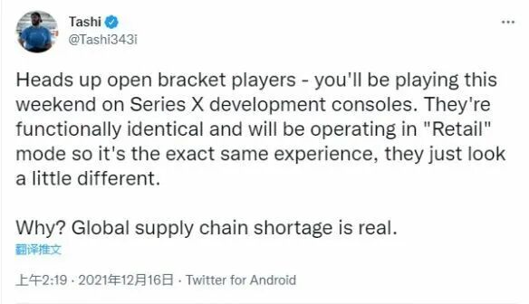 而343的电子竞技主管Tahir Hasandjekic也在推特上证实了这一消息。关于“拿开发机办比赛”的原因,Tahir Hasandjekic地回答是:全球供应链短缺是真实存在的。