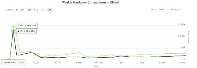 从2020年11月至2021年10月,两大主机的销量走势如图。可以发现,PS5(绿线)几乎一直压制XSX/S(黑线)。但两者的销量差距,已经趋于稳定。