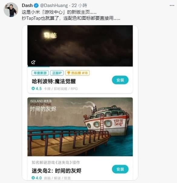 “这是小米‘游戏中心’的新版主页……抄TapTap也就算了,连配色和图标都要直接用……”连用两个省略号,大佬的无奈与愤慨溢出屏幕。
