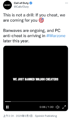 9月1日,《使命召唤》官方推特发布视频,矛头直至外挂:“这不是演习,如果你使用外挂,我们会捉住你的。”
