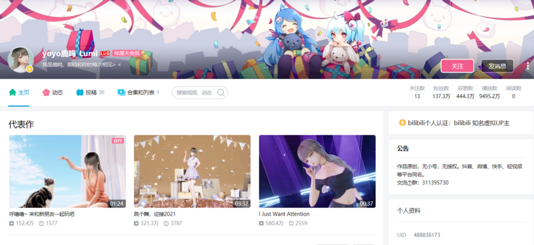 B站官方账号“yoyo鹿鸣_Lumi”这一年来粉丝倒是没有增长太多,但是仅凭19个投稿就拿下来9495.2万播放量还是太过恐怖了。