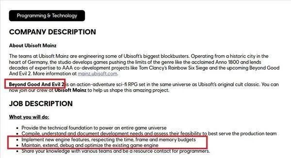 近日育碧发布了一则招聘信息,列表中新增了一条“《超越善恶2》项目工作的引擎程序员”职位。可以看到,这项职位的相关要求中,并不含有例如完成或设计游戏引擎的工作内容,主要是维护和优化。