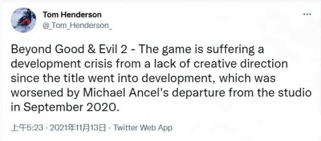 他还在推特上添油加醋,表示“自《超越善恶2》项目开始以来,由于缺乏创意方向,该游戏陷入了开发危机,而主创人员Michael Ancel 在2020年9月离开工作室更是雪上加霜”。