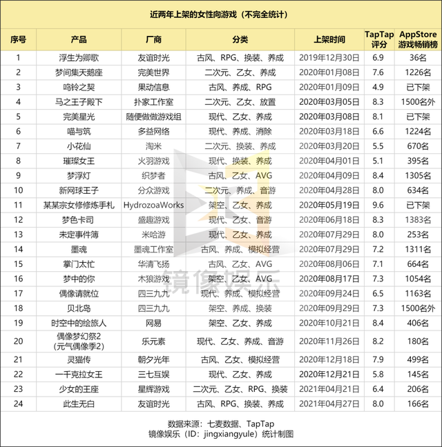首先,女性向游戏不等于恋爱类游戏。总体来看,换皮、清一色的画风人设和玩法、在不同游戏里和同一位CV谈恋爱已经成为现如今女性向游戏面临的最为广泛的难题,这类游戏也被称为“乙女游戏”。2020年被称为“国产乙女游戏元年”,根据Mob研究院的统计,2020年,乙女向游戏市场规模约占整体女性向游戏的30%,在近两年上线的近二十款女性向产品,乙女游戏占比过半。