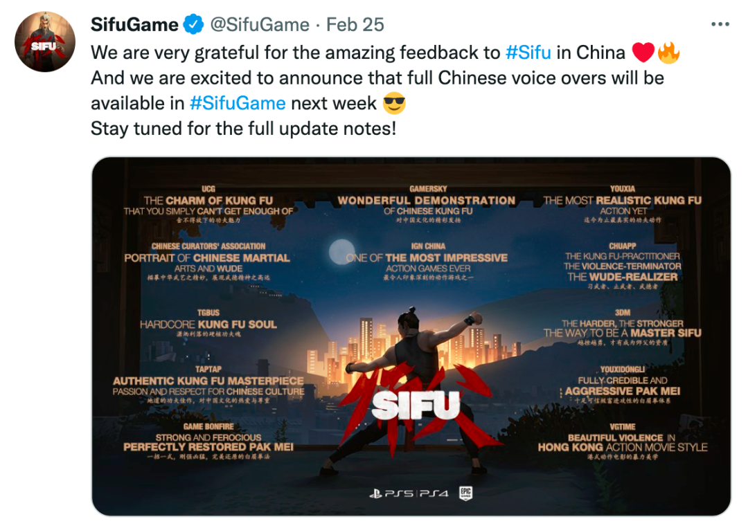 在游戏发售后,《师傅》很快受到各国玩家的关注,在庆祝游戏销量破百万的新闻稿中,Sloclap的执行制片人Pierre Tarno表示,该游戏在国内的销量仅次于北美地区,“工作室对这款游戏在中国的令人难以置信地反响也感到谦卑。团队内部衡量这样一款“中国功夫”游戏成功的标准就是游戏在当地的受欢迎程度。”