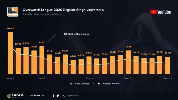 根据统计,国外直播平台上2020守望先锋联赛同时在线观众峰值为18.3万,比去年下降42%;平均观众数4.6万,比去年下降61.4%。