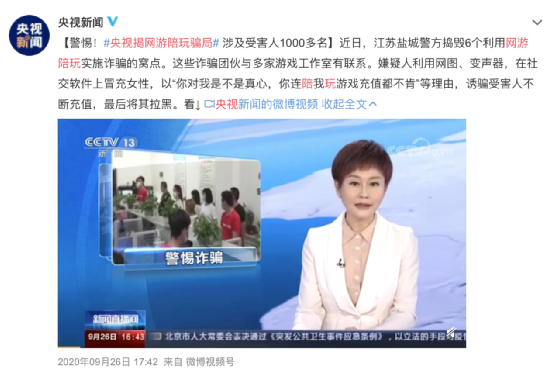 2020年9月,央视新闻曝光了一起“陪玩骗局”诈骗团伙利用网图、变声器等在各类社交软件上注册女性账号,以谈恋爱为名义诱导受害人充值获利,涉案金额高达200万,涉及受害人达到近1000名,最终有61名犯罪嫌疑人落网。