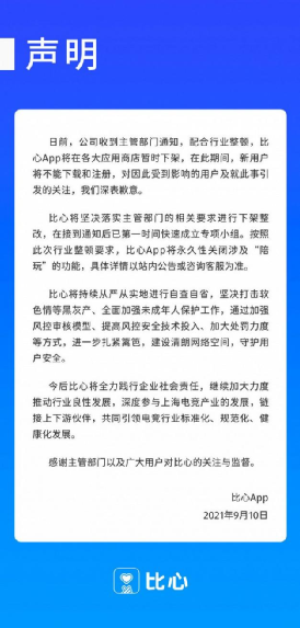 近日,“网信上海”发文称,游戏陪练应用比心App存在多个账号利用低俗、软色情信息诱导未成年人参与陪玩、诱导玩家用户下单等问题。对此,比心APP发布声明回应表示,将永久性关闭涉及“陪玩”的功能。除比心外,虎牙小鹿陪玩、欢聚Hello语音、可可西里、咪呀、一派、比伴陪玩等多个涉及游戏陪玩业务的APP也被下架。