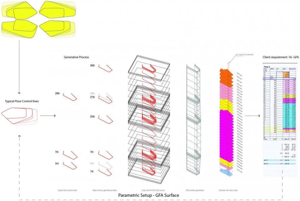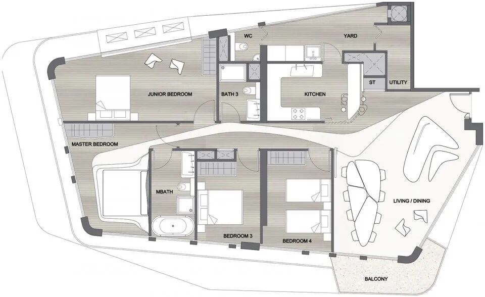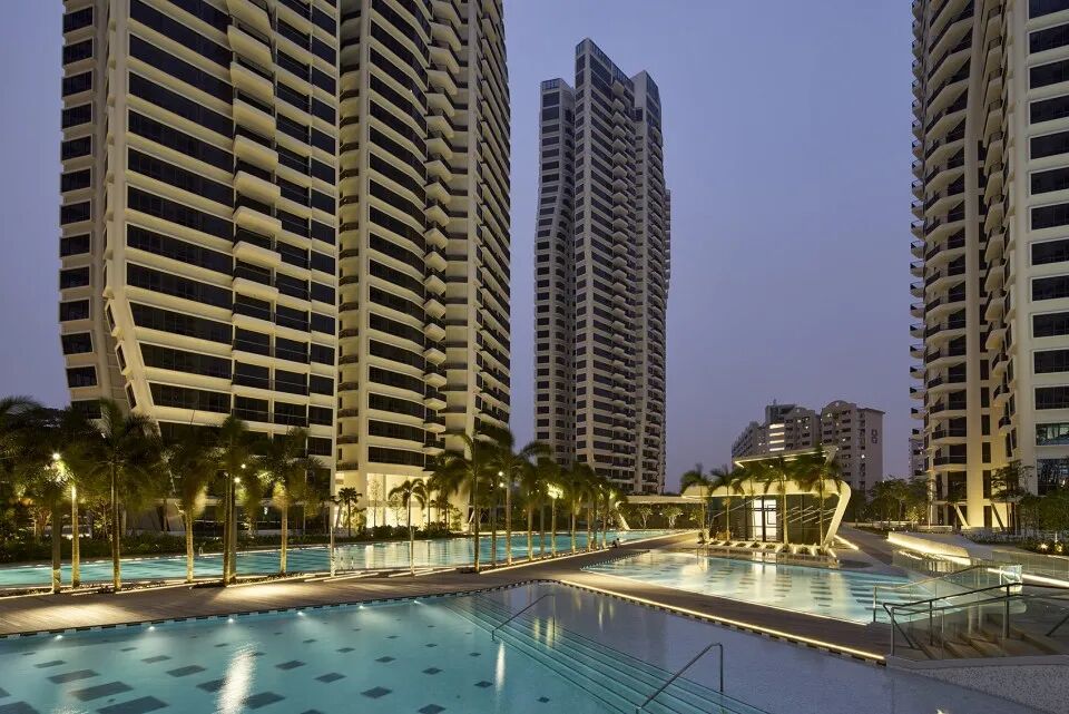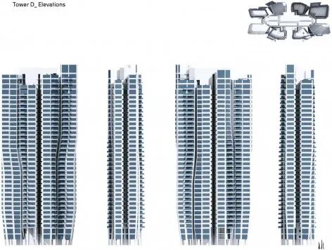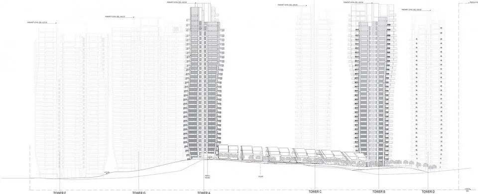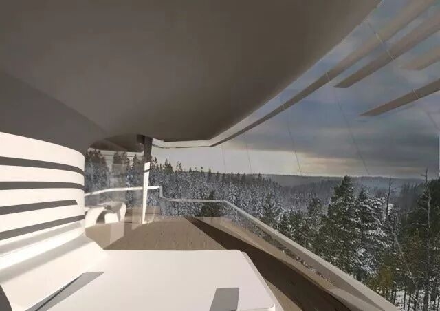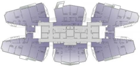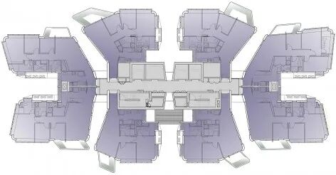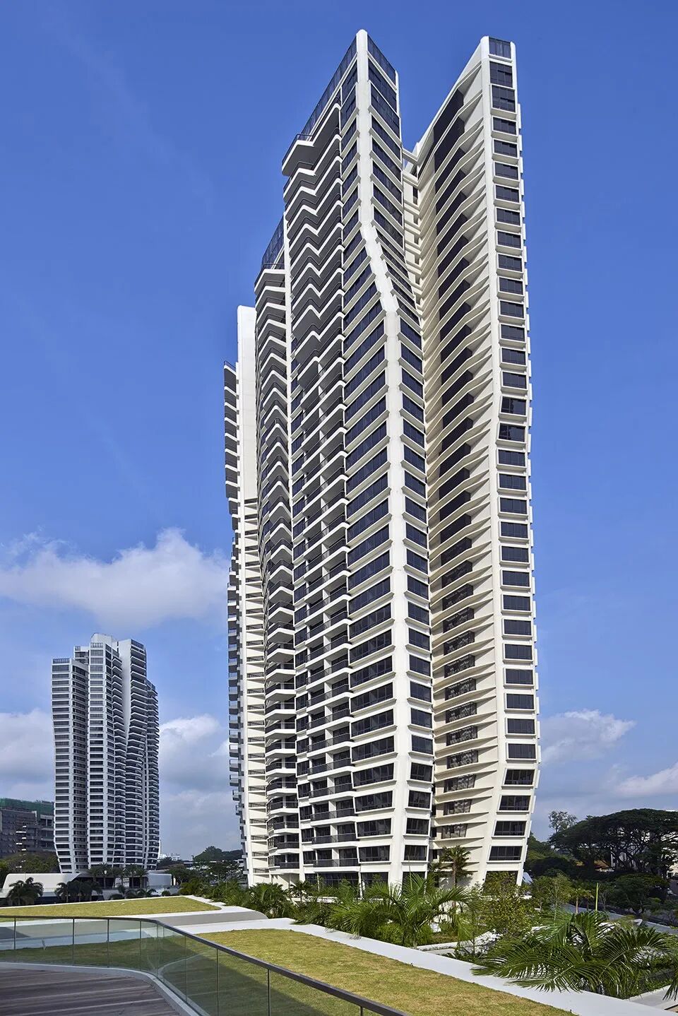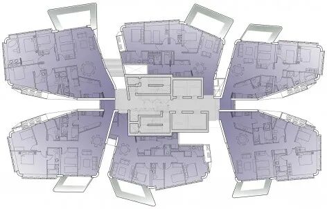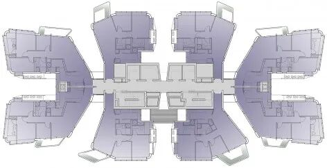 这栋摩天大厦在外观上采用了弧线形,并保持了大平面的特点,室内除了核心筒之外几乎没有立柱,为每个公寓创建了造型独特的阳台空间。