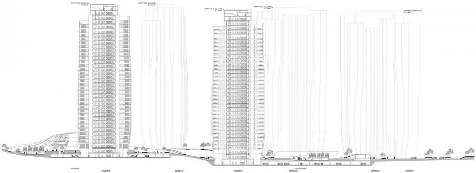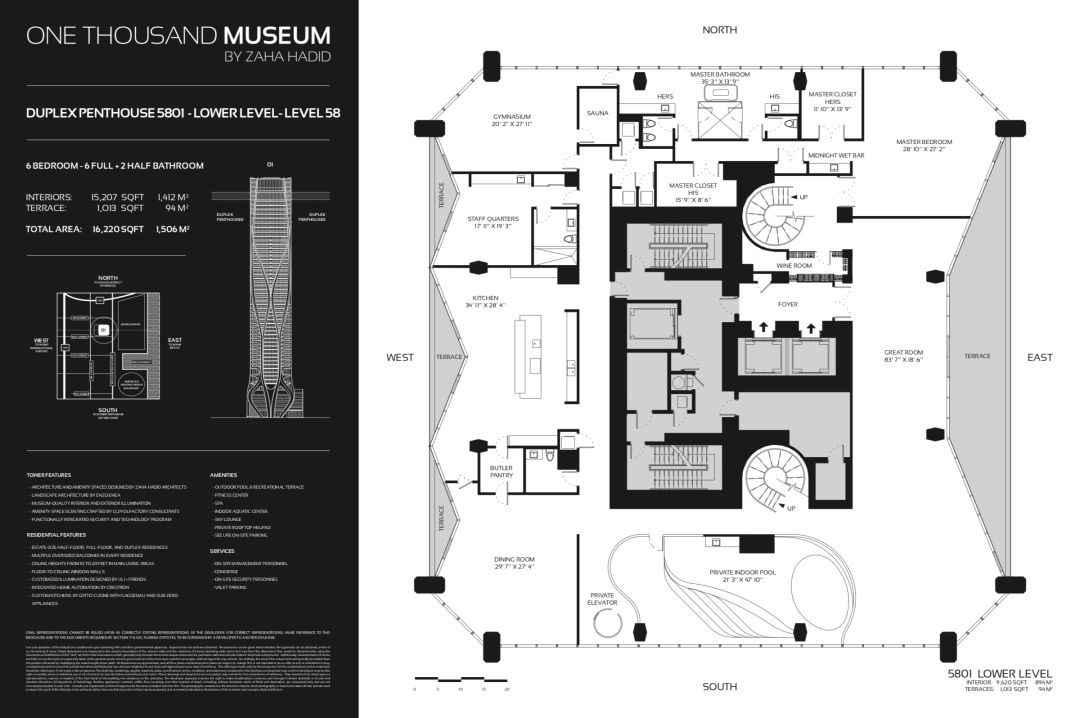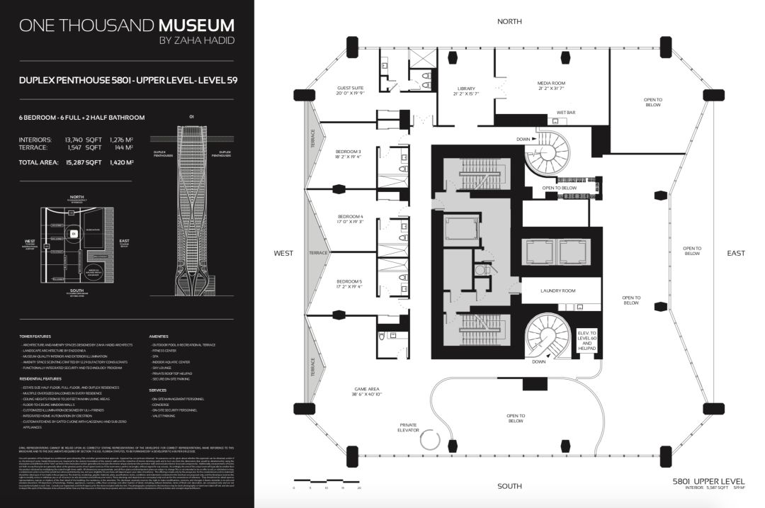 大厦的10 ~ 14 层将包括联排别墅性质的公寓。半层公寓将占用 15 ~ 49 层,50 ~ 57层为全平层公寓,复式阁楼将位于 58 和 59 层。